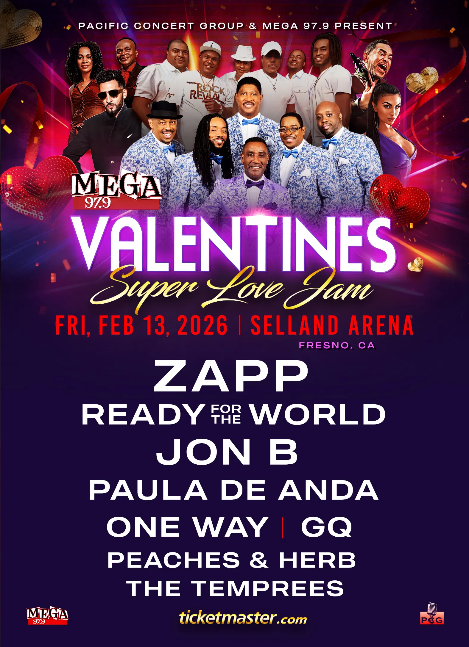 Mega 97.9 and Pacific Concert Group present Valentines Super Love Jam starring Zapp, Ready For The World, Jon B, Paula De Anda, One Way, GQ, Peaches & Herb and The Temprees. Don’t miss this huge concert Friday, February 13, 2026 at Selland Arena.