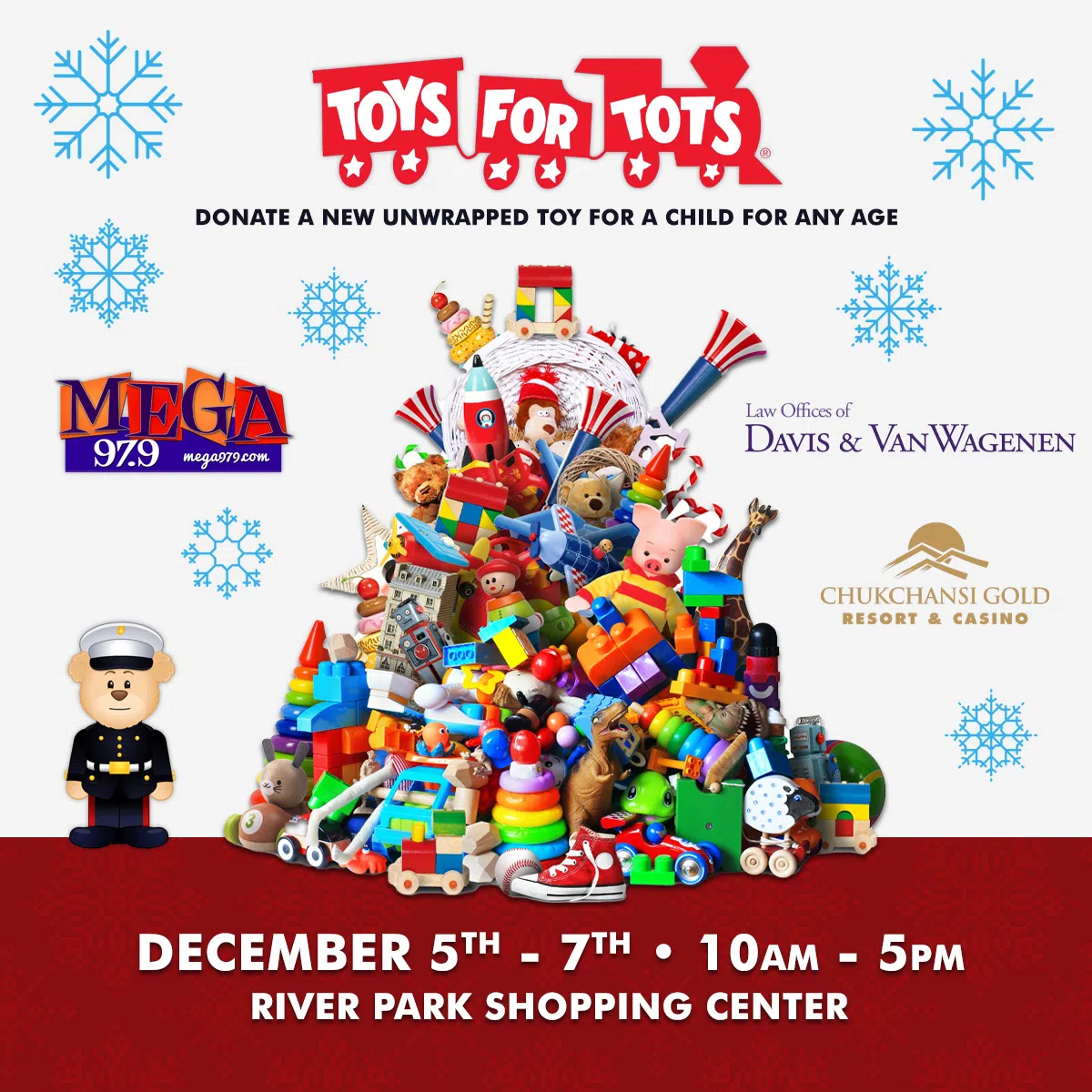 You can stop by and drop off your donation during our Toys For Tots Marathon event at the River Park Shopping Center, near the roundabout December 5th through 7th between 10:00 AM through 5:00 PM each day.
